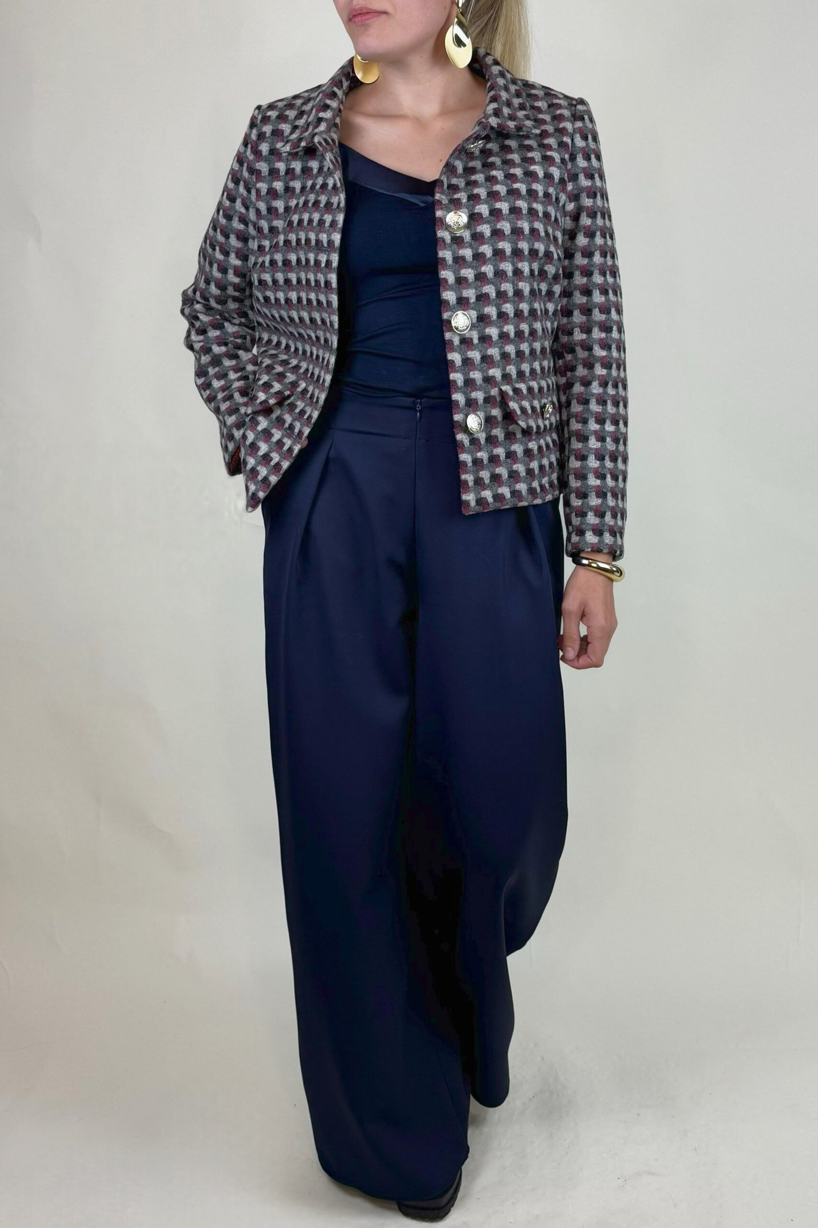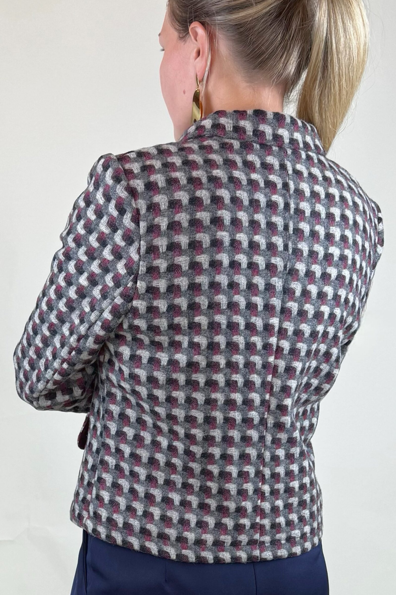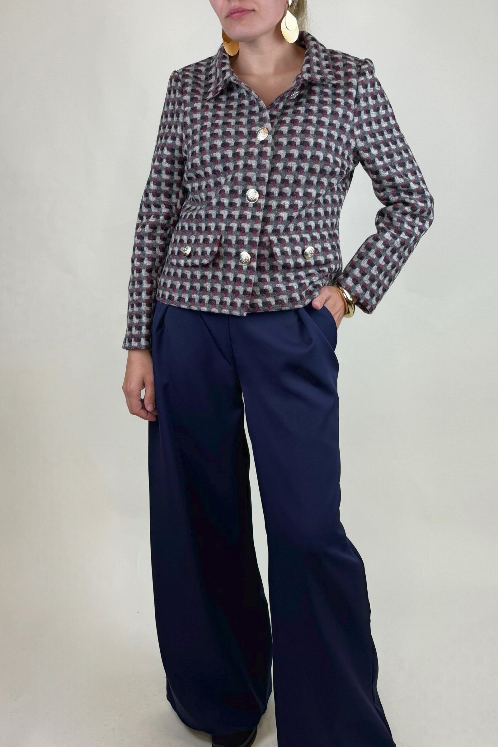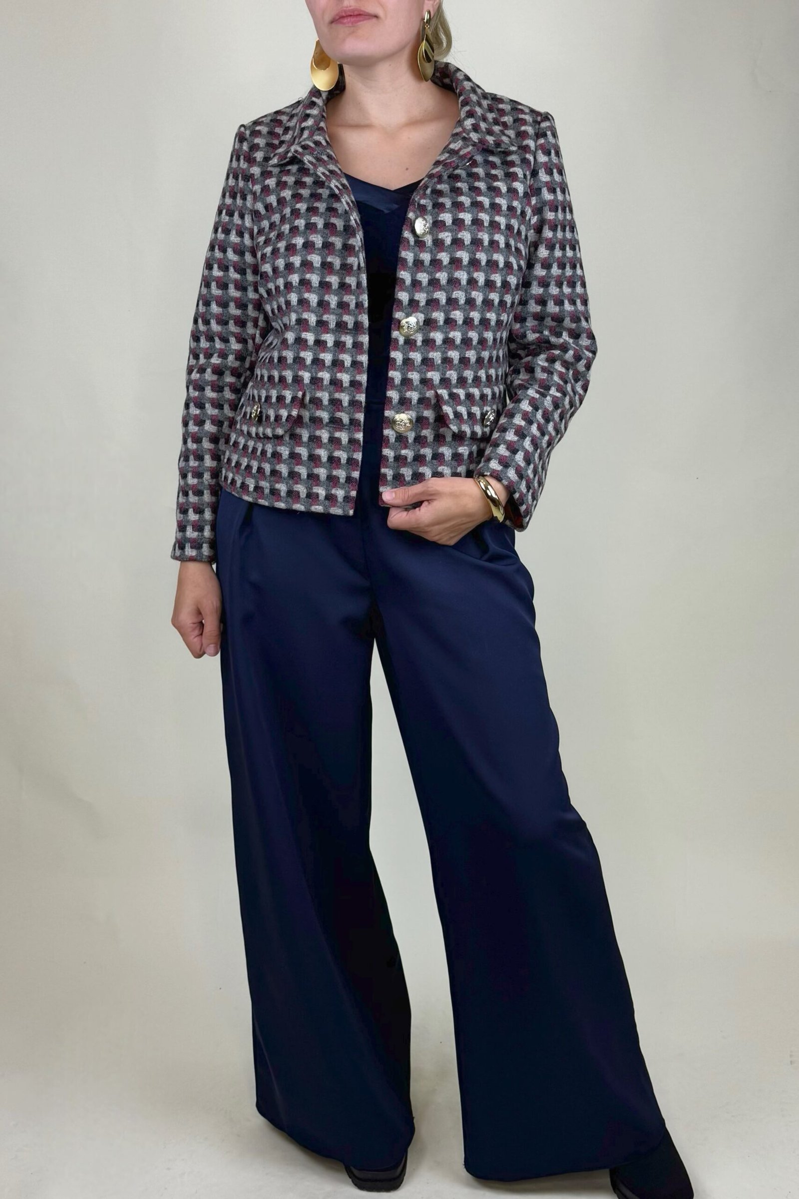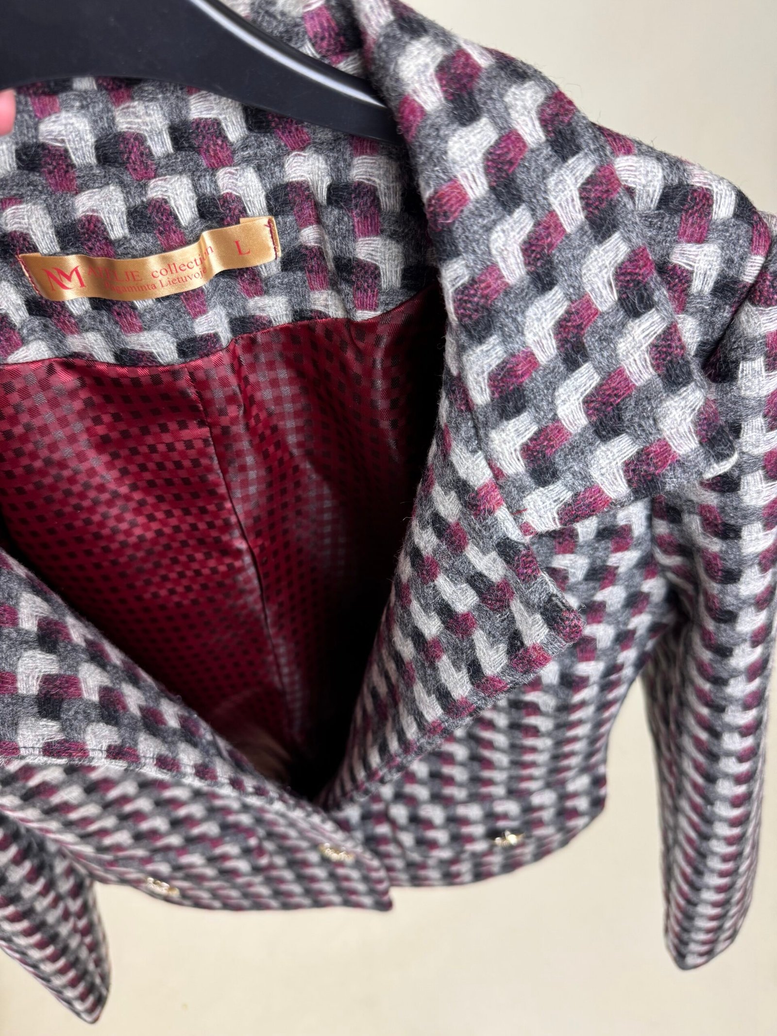 Švarkas su pamušalu, pasiūtas iš bukle tipo audinio, jis yra minkštas, natūralios sudėties(vilna), malonus nešiojimui.