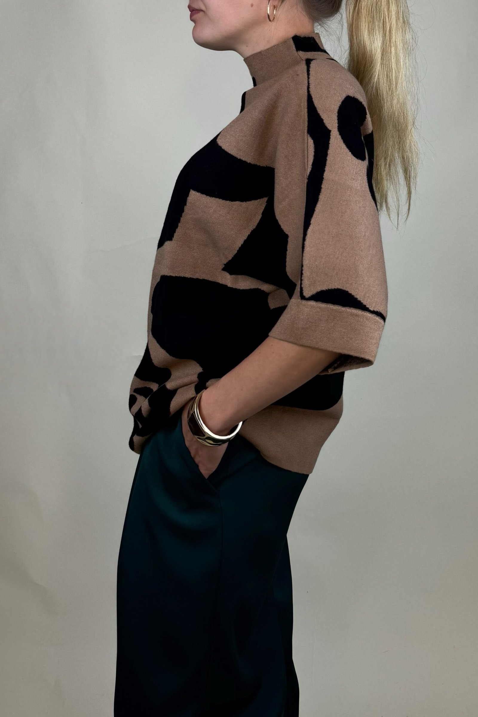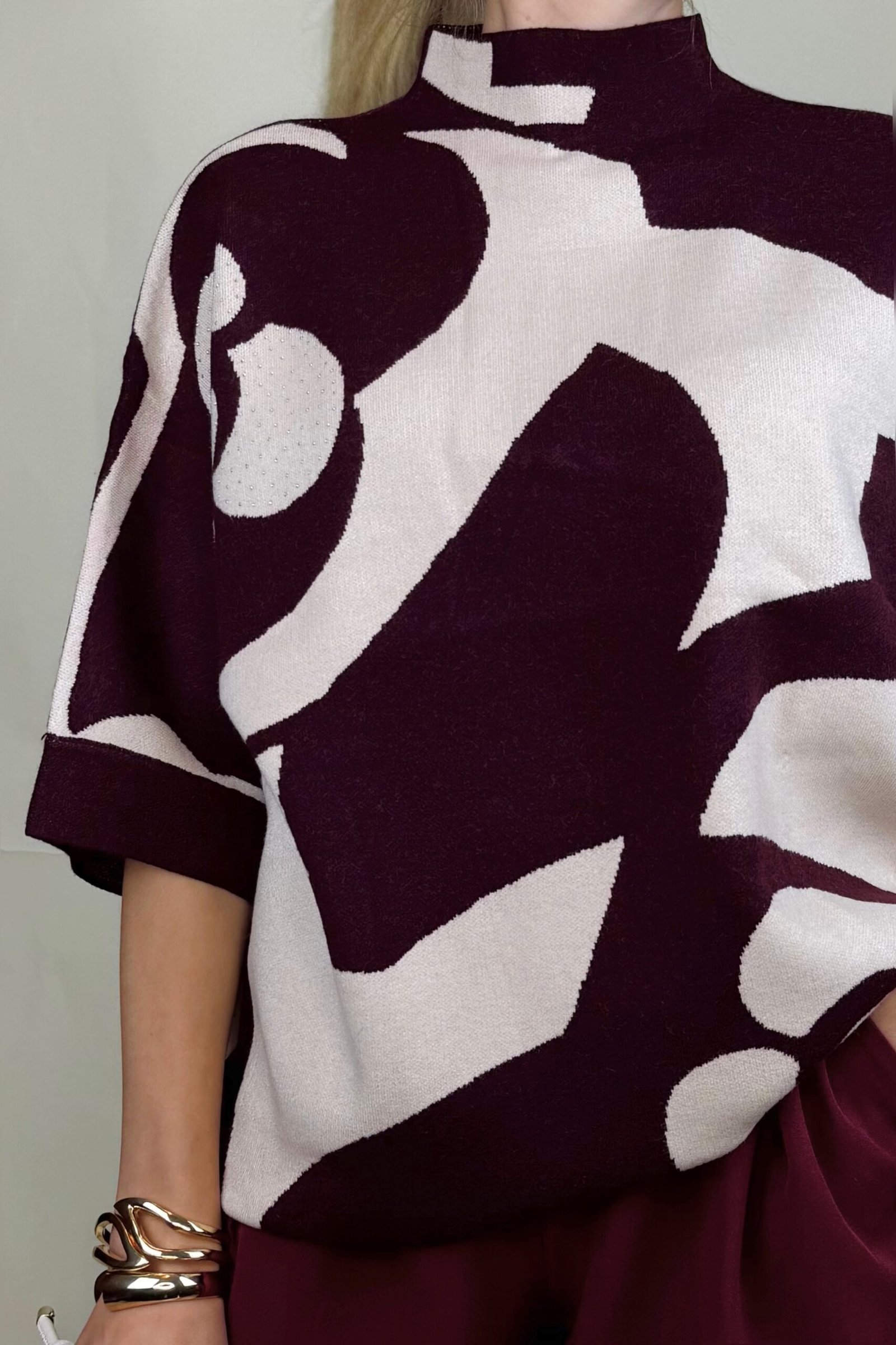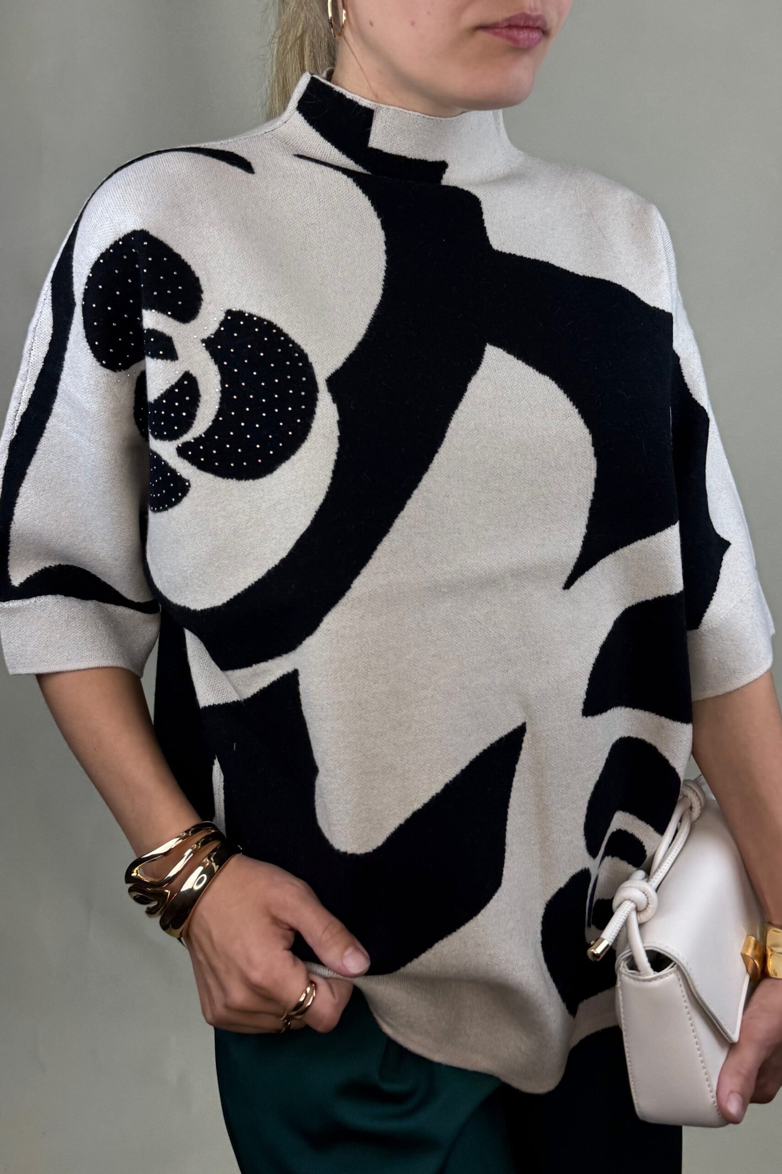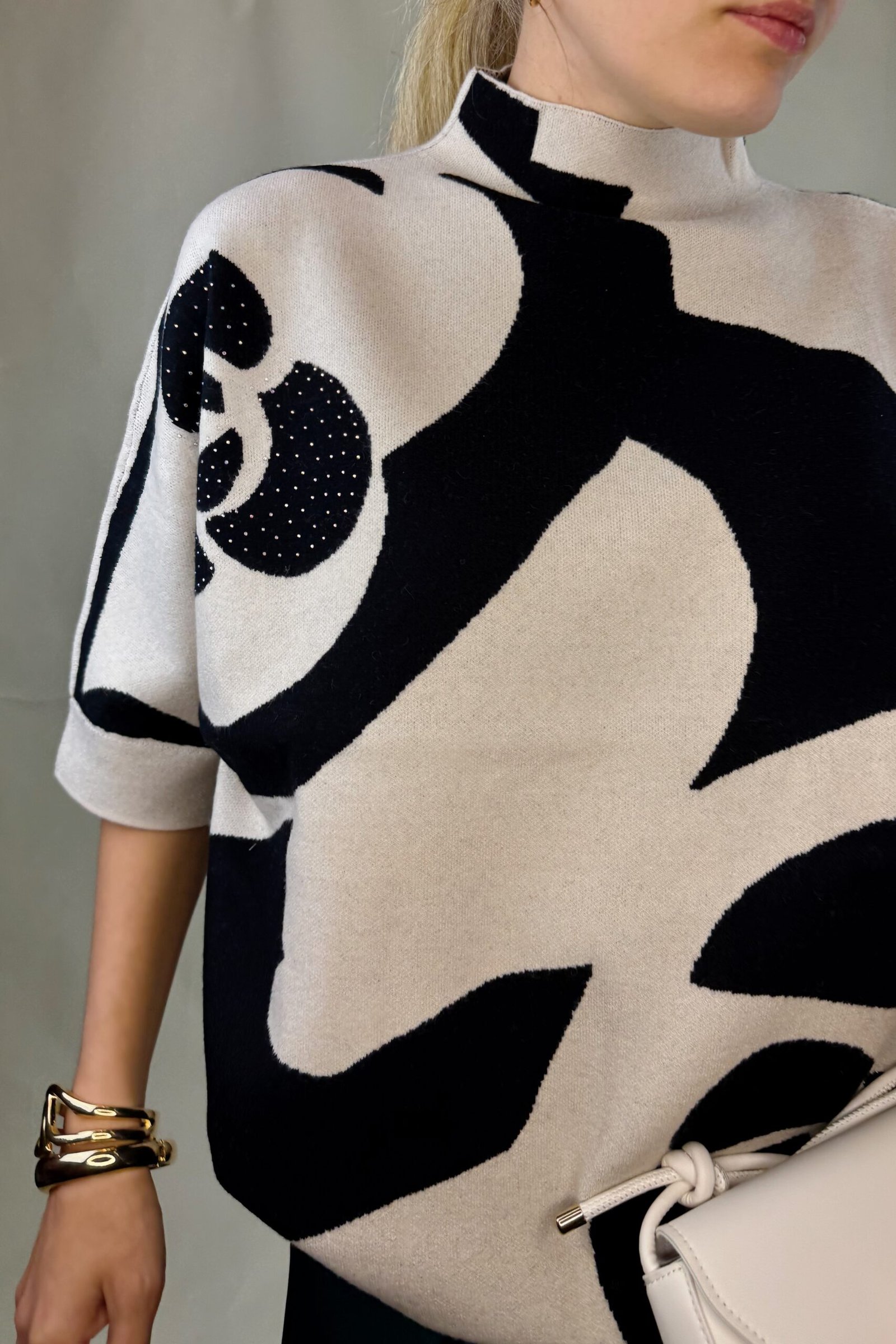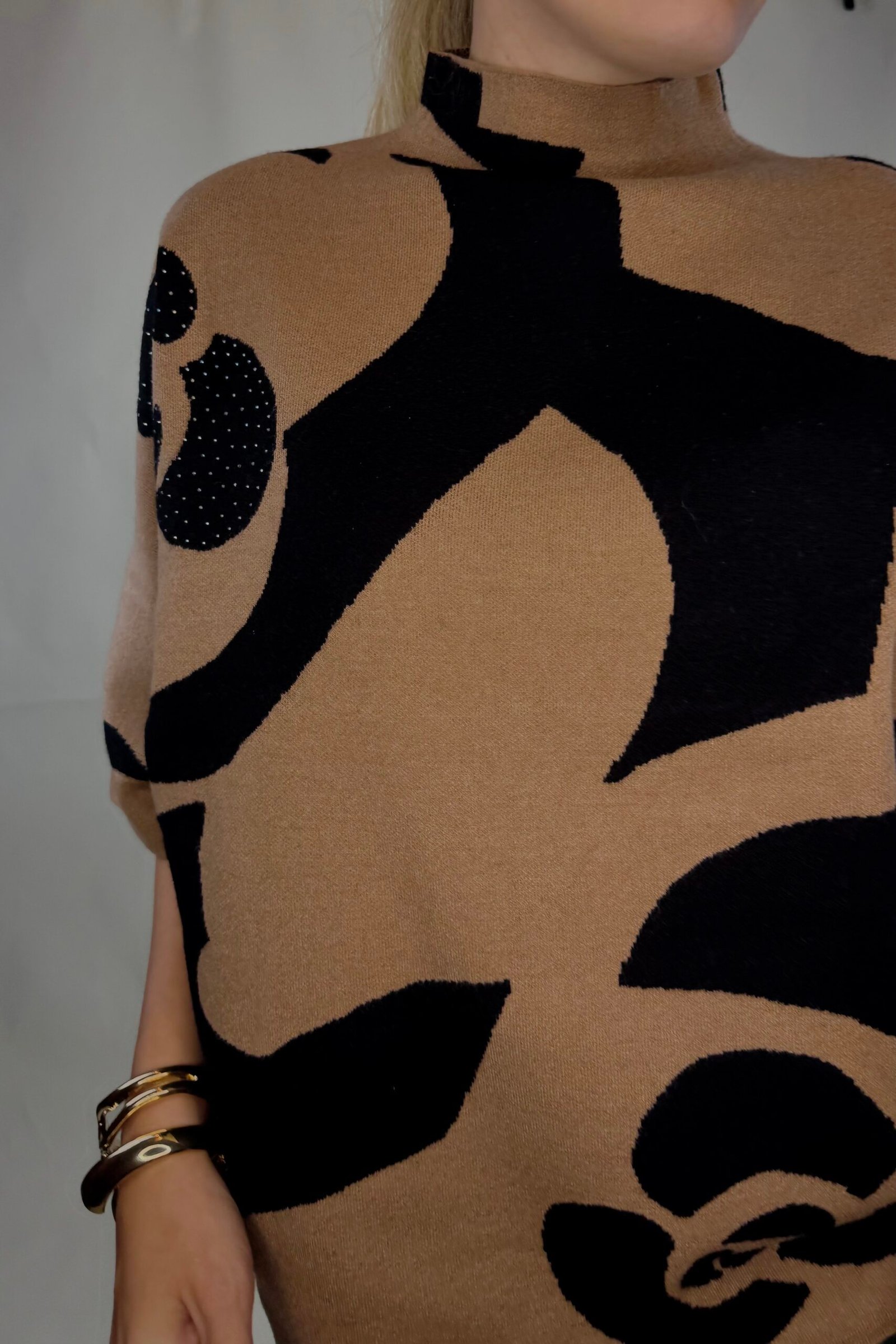 Atkreipkite dėmesį, kad megztinis gražiau atrodo, jei yra laisvesne ties krūtine, kaip pavaizduota nuotraukoje ir nėra labai aptempta.